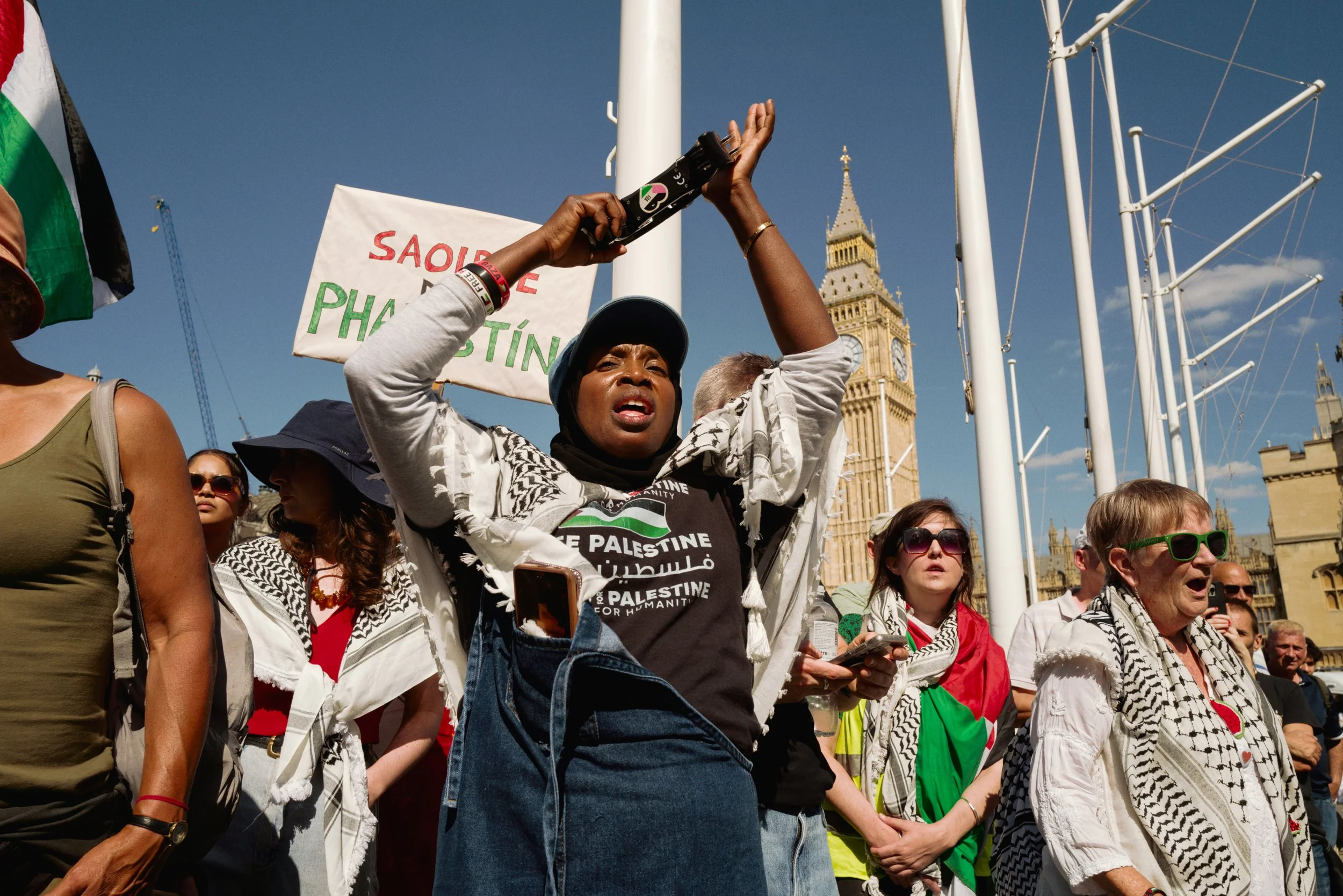 A demonstrator wearing a "Free Palestine" shirt plays the tambourine and chants during a Palestine solidarity protest in Parliament Square. - 9th August 2025 Parliment Square, London, United Kingdom